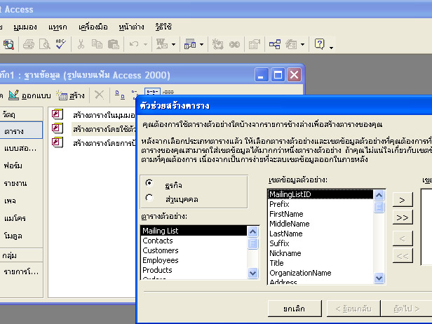 4.กำหนดแต่ละเขตข้อมูลให้กับตาราง ให้เหมาะสม และลดความซ้ำซ้อนของฟิลด์ ซึ่งในส่วนของตารางจะมีฟิลด์ข้อมูลอยู่หลายฟิลด์ด้วยกัน