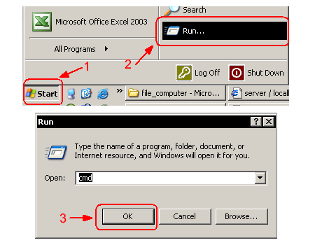 1.เปิดหน้าต่าง command โดยคลิก Start > Run พิมพ์ CMD กด OK
