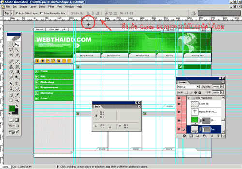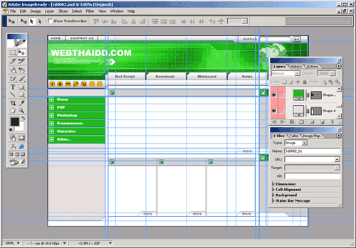 3. หลังจากที่เราสร้าง Guide เรียบร้อยแล้วให้เราส่งภาพที่สร้างไปยังโปรแกรม ImageReady ที่แถมติดมากับโปรแกรม Photoshop อยู่แล้วโดยกดที่ปุ่ม