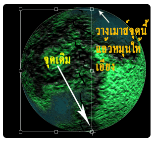 3. ที่เลเยอร์บน กด Ctrl+T แล้วก็ย้ายจุดศูนย์กลางการหมุนมาวางที่ด้านล่าง หมุนให้เอียงเล็กน้อย