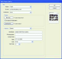 2.จะปรากฏหน้าต่าง Web Photo Gallery ขึ้นมาใหม่ ซึ่งเราจะจัดการตั้งแต่ค่าแรก คือ รูปแบบของหน้าตาเว็บไซต์ จะมีให้เลือกอยู่ใน Styles เมื่อเราเปลี่ยนรูปแบบก็จะมีหน้าต่างแสดงภาพตัวอย่างให้เห็นทางด้านขวามือด้วย ต่อไปให้ใส่อีเมล์ และนามสกุลไฟล์ แนะนำว่าควรเป็น .html ค่ะ จากนั้นคลิ้กที่ Browse เพื่อจัดการระบุภาพที่เราต้องการนำมาทำอัลบั้ม (รูปที่ 2)