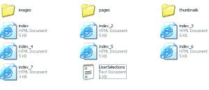 9. สำหรับโฟลเดอร์ และไฟล์ต่างๆ ที่เกิดขึ้นในอัลบั้มภาพ จะประกอบไปด้วย โฟลเดอร์ images มีไว้สำหรับเก็บภาพขนาดปกติสำหรับต้นฉบับ , pages ภายในจะเป็นไฟล์ html เพื่อแสดงหน้าเว็บไซต์ของภาพแต่ละภาพ, thumbnails จะเก็บภาพขนาดเล็กที่แสดงในหน้า index ภาพ นอกจากนี้ยังมีไฟล์ index-xxxx อีกมากมาย ซึ่งเป็นไฟล์หลังที่จะแสดง index ของภาพในแต่ละหน้านั่นเอง สำหรับผู้ที่ต้องการนำไปใส่ในอินเทอร์เน็ต ต้องทำการอัพโหลดไฟล์ทั้งหมดไปไว้ในเซิรฟ์เวอร์ด้วย หากขาดไฟล์ใดไฟล์หนึ่งอาจจะทำให้การแสดงผลบางส่วนไม่สมบูรณ์ หรืออาจจะนำไปประยุกต์ใช้สำหรับเก็บภาพไว้ในแผ่นซีดีรอม ที่สามมารถเรียกดูภาพต่างๆ เหล่านี้ได้ง่ายยิ่งขึ้น (รูปที่ 9)
