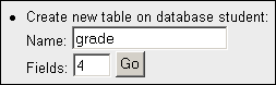 3.> หลังจากนั้นให้เราสร้างตาราง เพื่อรองรับข้อมูลต่างๆ ที่เราจะเก็บ ในที่นี้ผมจะสรั้างตาราง grade เพื่อเก็บข้อมูลของนักศึกษา ให้เราใส่ชื่อตารางทีเราต้องการสร้างในช่อง Create new table และที่สำคัญเราควรกำหนด Fields ที่เราจะเก็บข้อมูลด้วย