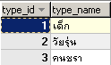 tb_type เก็บประเภท(คน) CREATE TABLE `tb_type` ( `type_id` int(2) NOT NULL auto_increment, `type_name` char(100) default NULL, PRIMARY KEY (`type_id`) ); INSERT INTO `tb_type` VALUES (1,'เด็ก'); INSERT INTO `tb_type` VALUES (2,'วัยรุ่น'); INSERT INTO `tb_type` VALUES (3,'คนชรา'); |
