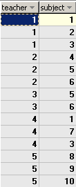 | CREATE TABLE `rel_tb_teacher_subject` ( `teacher_id` int(3) NOT NULL auto_increment, `subject_id` int(3) NOT NULL default '0', PRIMARY KEY (`teacher_id`,`subject_id`) ) TYPE=MyISAM; INSERT INTO `rel_tb_teacher_subject` VALUES (1,1); INSERT INTO `rel_tb_teacher_subject` VALUES (1,2); INSERT INTO `rel_tb_teacher_subject` VALUES (1,3); INSERT INTO `rel_tb_teacher_subject` VALUES (2,4); INSERT INTO `rel_tb_teacher_subject` VALUES (2,5); INSERT INTO `rel_tb_teacher_subject` VALUES (2,6); INSERT INTO `rel_tb_teacher_subject` VALUES (3,5); INSERT INTO `rel_tb_teacher_subject` VALUES (3,6); INSERT INTO `rel_tb_teacher_subject` VALUES (4,1); INSERT INTO `rel_tb_teacher_subject` VALUES (4,3); INSERT INTO `rel_tb_teacher_subject` VALUES (4,7); INSERT INTO `rel_tb_teacher_subject` VALUES (5,8); INSERT INTO `rel_tb_teacher_subject` VALUES (5,9); INSERT INTO `rel_tb_teacher_subject` VALUES (5,10); |