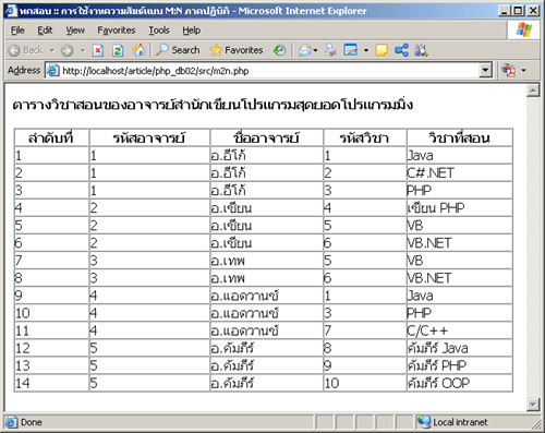 ถ้าโจทย์มีอยู่ว่า สำนักเขียนโปรแกรมสุดยอดโปรแกรมมิ่ง มีอาจารย์สอนเขียนโปรแกรมและแต่ละคนรับผิดชอบวิชาที่สอนดังนี้