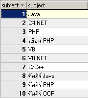 | CREATE TABLE `tb_subject` ( `subject_id` int(3) NOT NULL auto_increment, `subject` varchar(50) default NULL, PRIMARY KEY (`subject_id`) ) TYPE=MyISAM; INSERT INTO `tb_subject` VALUES (1,'Java'); INSERT INTO `tb_subject` VALUES (2,'C#.NET'); INSERT INTO `tb_subject` VALUES (3,'PHP'); INSERT INTO `tb_subject` VALUES (4,'เซียน PHP'); INSERT INTO `tb_subject` VALUES (5,'VB'); INSERT INTO `tb_subject` VALUES (6,'VB.NET'); INSERT INTO `tb_subject` VALUES (7,'C/C++'); INSERT INTO `tb_subject` VALUES (8,'คัมภีร์ Java'); INSERT INTO `tb_subject` VALUES (9,'คัมภีร์ PHP'); INSERT INTO `tb_subject` VALUES (10,'คัมภีร์ OOP'); |