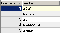 | CREATE TABLE `tb_teacher` ( `teacher_id` int(3) NOT NULL auto_increment, `teacher` varchar(50) default NULL, PRIMARY KEY (`teacher_id`) ) TYPE=MyISAM; INSERT INTO `tb_teacher` VALUES (1,'อ.อีโก้'); INSERT INTO `tb_teacher` VALUES (2,'อ.เซียน'); INSERT INTO `tb_teacher` VALUES (3,'อ.เทพ'); INSERT INTO `tb_teacher` VALUES (4,'อ.แอดวานซ์'); INSERT INTO `tb_teacher` VALUES (5,'อ.คัมภีร์'); |
