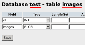 | <? $hostname = "localhost"; $user = ""; $password = ""; $dbname = "test"; $tblname = "images"; mysql_connect($hostname, $user, $password) or die("ติดต่อฐานข้อมูลไม่ได้"); mysql_select_db($dbname) or die("เลือกฐานข้อมูลไม่ได้"); copy($files,$files_name); $pic_size = filesize($files_name); $pic_data = addslashes(fread(fopen($files_name,"r"),$pic_size)); $sql = "insert into $tblname(images) values ('$pic_data')"; $dbquery = mysql_db_query($dbname, $sql); mysql_close(); ?> |