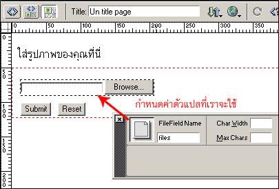 | <html> <head> <title>Un title page</title> <meta http-equiv="Content-Type" content="text/html; charset=windows-874"> </head> <body bgcolor="#FFFFFF"> <br> ใส่รูปภาพของคุณที่นี่ <form name="form1" method="post" action="add.php" enctype="multipart/form-data"> //อย่าลืมกำหนด Action นะครับ <input type="file" name="files"> <br> <input type="submit" name="Submit" value="Submit"> <input type="reset" name="Submit2" value="Reset"> </form> </body> </html> |