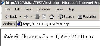 | <? $number=1568971; echo "สั่งสินค้าเป็นจำนวนเงิน = ".number_format($number,2,'.',',')." บาท"; //2 ที่เราเขียนเป็นการระบุจุดทศนิยม ?> |