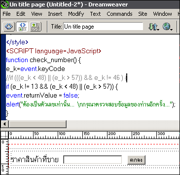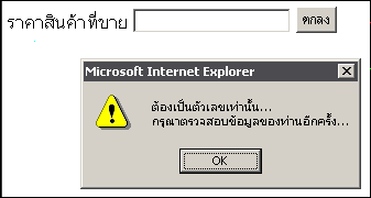 | <SCRIPT language=JavaScript> function check_number() { e_k=event.keyCode //if (((e_k < 48) || (e_k > 57)) && e_k != 46 ) { if (e_k != 13 && (e_k < 48) || (e_k > 57)) { event.returnValue = false; alert("ต้องเป็นตัวเลขเท่านั้น... \nกรุณาตรวจสอบข้อมูลของท่านอีกครั้ง..."); } } </script> |