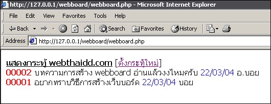 1. สร้างไฟล์เอกสาร php ขึ้นมาตั้งชื่อว่า webboard.php แล้วเขียนโค้ดดังนี้