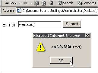 | <script type="text/javascript"> function validate() { form_mail=document.form1 mail=form_mail.email.value.indexOf("@") submitOK="True" if (mail==-1) { alert("คุณยังไม่ได้ใส่ (Email)") submitOK="False" } if (submitOK=="False") { return false } } </script> |