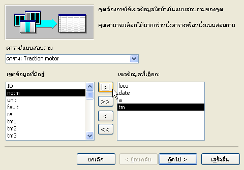 2. หลังจากนั้นจะปรากฎกล่องข้อความ ให้คุณเลือกแหล่งข้อมูลในแบบสอบถามของคุณ คุณสามารถเลือกได้มากกว่า 1 ตาราง ให้คุณเลือกเขตข้อมูลที่คุณต้องการจากเขตข้อมูลที่มีอยู่ด้านซ้ายมาไว้ด้านขวา หลังจากนั้นคลิก ถัดไป