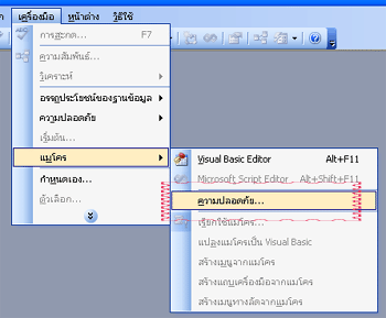 2.จากนั้นให้ท่านเลือกคำสั่งที่เมนู Tools(เครื่องมือ) แล้วตามด้วย Macro/Security(แมโคร/ความปลอดภัย)