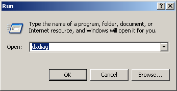 2. ในช่องข้อความ Open: พิมพ์ dxdiag แล้วคลิกปุ่ม OK