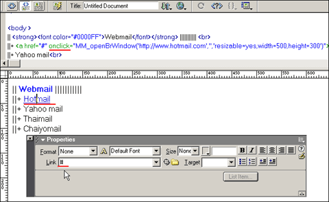4. หลังจากนั้นให้เรา Cut เอาคำสั่ง Onload นั้นมาโดยที่ใน Body จะว่างไม่มีการเรียกใช้ Function แล้วเรานำมาวางที่ Link ที่เราต้องการ Popup ใส่ # ที่ Link กำหนดให้ครบทุก Link ตามที่เราต้องการ