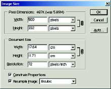 วิธีการกำหนดขนาดให้ไปที่เมนู Image - Image Size หรือกด key Alt + I + I จะปรากฏไดอะล็อกบ็อกซ์ขึ้นมา ในที่นี้ผมจะยึดความกว้างไว้ที่ 500 พิกเซล แล้วให้ความสูงของภาพเปลี่ยนแปลงไปตาม โดยจะต้องคลิ้ก เลือกที่ Constrain Proportions ไว้ด้วย เพื่อให้ขนาดความสูงและความความแปรเปลี่ยนไปตามกันด้วยสัดส่วนเท่าเดิม ในช่อง resolution ให้กำหนดเป็น 72 พิกเซลต่อนิ้ว ซึ่งจะเท่ากับขนาดของหน้าจอคอมพิวเตอร์ จากนั้นกดปุ่ม OK เพื่อเปลี่ยนแปลงขนาดของรูป (ดังรูปที่ 2)