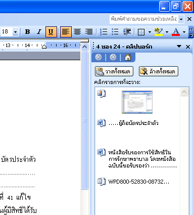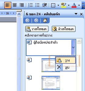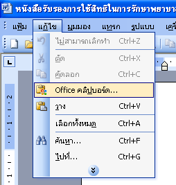 1.เมื่อเรามีความจำเป็นต้องการใช้คลิปบอร์ดที่เราทำการคัดลอกไว้ซึ่งก่อนหน้านี้ก็จะถูกนำไปวางในคลิปบอร์ดซึ่งปกติเมื่อเราทำการวางโปรแกรมก็จะทำการวางคลิปล่าสุด แต่ในที่นี้เราจะสามารถเลือกคลิปที่เราต้องการย้อนหลังได้ ให้ท่านทำการเลือกเมนู แก้ไข/Officeคลิปบอร์ด