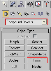 ไปที่ Command Panel เลือก Cgometry เลือกชุด Compound Object แล้วก็เลือก Terrain นะครับ