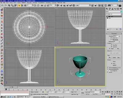 ขั้นตอนที่ 2. ใช้คำสั่ง Lathe ในส่วน Modifier List แล้ว Click ที่ส่วน Weld Core และ Flips Normals ในส่วน Align เลือกคำสั่ง Min, Center หรือ Max เพื่อให้ได้ออกมาดังรูป เพิ่ม Segment เป็น 30 เพื่อไม่ให้เกิดเหลี่ยม