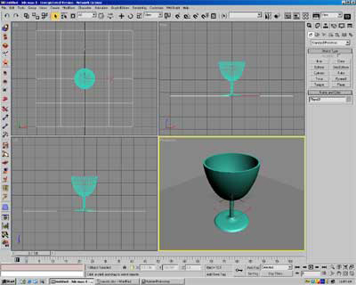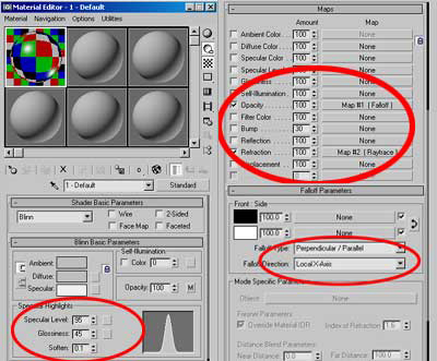 ขั้นตอนที่ 5. กดปุ่ม M เพื่อเลือก Meterial Editor แล้วไปที่ Blinn Basic Parameters Rollout ปรับค่า Specular Level = 95, Glossiness = 45 เสร็จแล้วไปที่ Maps Rollout Click ที่ Reflaction Map แล้วเลือก Raytrace Map จาก Material/Map Browser ที่ Opacity Map กำหนดให้เป็น Falloff Map, Falloff Direction = Local x Axis เสร็จแล้ว Assign Material ให้กับ Lathe Object ของเรา แล้วทำการ Render เพื่อชมผลงานได้เลยครับ
