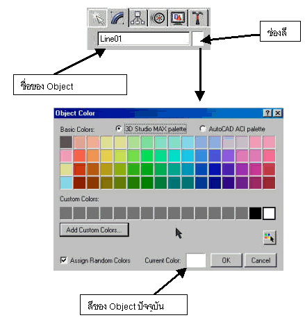 เมื่อเราได้ Object ครบทุกตัวแล้ว คราวนี้ เราจะใส่สีสันให้กับงาน โดยขั้นพื้นฐานนั้น เราสามารถเปลี่ยนสีของ Object ได้ทันที โดยคลิกเปลี่ยนสีได้ที่ ช่องกำหนดสีด้านข้างของชื่อ Object ที่กำลังทำงานอยู่