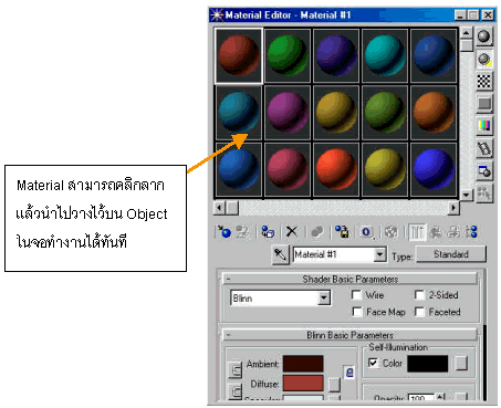 หลังจากเปลี่ยนสี Object ตามความพอใจแล้ว คราวนี้จะมาเปลี่ยนสีของทรงกลม ให้เป็นภาพท้องฟ้า ให้กด แป้น Keyboard "M" จะได้หน้าต่าง Material Editor ขึ้นมาดังรูปข้างล่าง