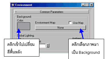 เราสามารถเปลี่ยนพื้นสีด้านหลังของ Logo หรือเอาภาพมาใส่เป็นพื้นหลังของ Logo ได้ โดยเข้าไปที่ Menu Rendering / Environment จะได้หน้าต่างด้านล่าง
