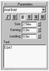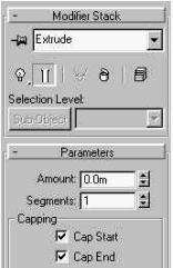 แล้ว เลือกคำสั่ง Extrude จากนั้นเลื่อนแถบคำสั่งลงมาด้านล่างจะได้ Command Panel ดังภาพ ให้ใส่ความหนาของข้อความที่ Amount