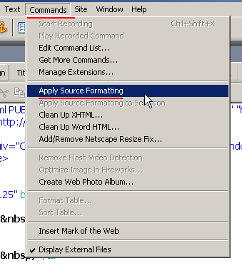 การจัดเรียง code ที่เป็นระเบียบสำคัญมากสำหรับคนที่เขียนโปรแกรม แต่ถ้าเราเขียนไปหลายๆ บรรทัดแล้วจะมานั่งจัดก็คงจะเสียเวลา เราให้ dreamweaver ช่วยจัดให้ดีกว่า
