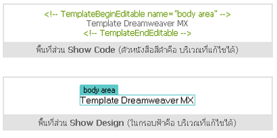 4. สร้างพื้นที่สำหรับแก้ไขได้ โดยคลิกปุ่ม Editable Region ที่แท็บ Template