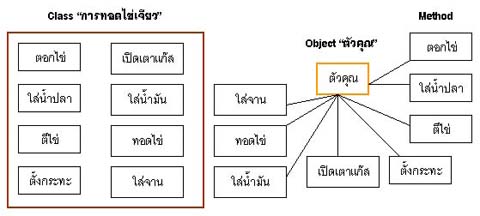 | 8 ขั้นตอนข้างต้นเป็นการกระทำที่เกิดขึ้นในการทอดไข่เจียว ผมจะเรียกการกระทำเหล่านี้ว่า Method สิ่งต่อไปเรามาดูว่าใครเป็นคนกระทำ 8 ขั้นตอนเหล่านี้ ซึ่งก็ คือ ตัวเรานั้นเอง ผมให้ตัวคนทอดเป็น Object และสุดท้ายภาพรวมของการทอดไข่เจียวนั้นผมให้เป็น Class เราจะตั้งชื่อว่า "คลาสการทอดไข่เจียว" ดูแผนภาพต่อไปนี้ครับ | |