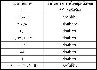 อธิบายโปรแกรม จากโปรแกรมเป็นการทดสอบการใช้เครื่องหมายเปรียบเทียบทางคณิตศาสตร์โดยกำหนดให้ตัวแปร x และ y มีค่าคงที่ค่าหนึ่ง จากนั้นนำตะวแปร x และ y มาใช้เครื่องหมายต่างๆ เปรียบเทียบกันโดยใช้เครื่องหมายเปรียบเทียบและเครื่องที่ใช้เชื่อมประโยค ให้เราลองสังเกตุผลลัพธ์ที่ออกมาดูนะครับว่าตรงกับการคำนวณตามที่เราคิดไว้ไหม ลำดับความสำคัญของตัวดำเนินการ จากตารางเป็นการแสดงถึงลำดับความสำคัญของตัวดำเนินการในภาษา java ซึ่งการคำนวณในทางคอมพิวเตอร์นั้นจะไม่เหมือนวิธีการคำนวณของมนุษย์ยกตัวอย่างเช่น 4 + 5 = 9 มนุษย์ใช้วิธีการคำนวณโดยคิดจากซ้ายไปขวา โดยเขียน 4 + 5 แล้วจึงเท่ากับ 9 แต่ในทางคอมพิวเตอร์จะใช้วิธีการคำนวณดังต่อไปนี้ 9 = 4 + 5 จะเห็นว่าจะมีการบวกค่า 4 กับ 5 จากทางขวามือแล้วนำค่าที่ได้ไปเก็บไว้ทางซ้ายมือ ดังนั้นจากตารางลำดับความสำคัญดังกล่าวจึงเป็นการลำดับการคำนวณที่เกิดขึ้นเมื่อในประโยคหนึ่งๆ มีเครื่องหมายการคำนวณที่มากกว่า 1 เครื่องหมายและมีเครื่องหมายหลายชนิดปนกัน ตัวอย่างเช่น