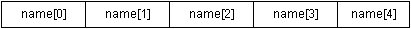 ซึ่งจะเริ่มต้นที่ 0 เสมอ เช่น จากตัวอย่างตัวแปร name ถูกกำหนดขนาดไว้ 5 พื้นที่ที่ถูกจองก็จะเป็นดังรูป