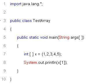 อธิบายโปรแกรม จากโปรแกรมจะเป็นตัวอย่างง่ายๆ นะครับคือ มีการประกาศตัวแปร x เป็นอะเรย์โดยมีการระบุค่าเริ่มต้นใน { } ไว้ 5 จำนวน ในกรณีนี้ตัวเลขเหล่านี้นจะถูกจัด เก็บในอะเรย์โดยอัตโนมัติซึ่งในบรรทัดที่ 8 จะให้แสดงค่าที่ตำแหน่งอะเรย์ x[1] ออกมา ซึ่งค่าที่ได้คือ 2 นั่นเอง