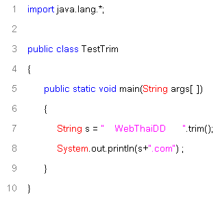 อธิบายโปรแกรม จากโปรแกรมผมกำหนดให้ตัวแปร s เก็บคำว่า WebThaiDD (อดไม่ได้) โดยผมจะเว้นช่องว่างไว้ทั้งด้านหน้า และด้านหลัง หลังจากนั้นเราจะใช้ trim() เพื่อตัดช่องว่างทิ้งไป output ที่ออกมาจะได้คำว่า "WebThaiDD.com" ครับ