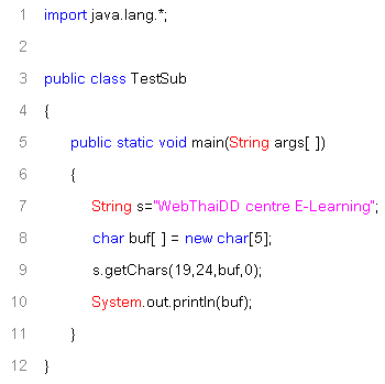 อธิบายโปรแกรม method นี้ถ้าดูดีๆ จะคล้ายกับ substring() แหละครับ แต่ต่างกันตรงที่ตัวอักษรเหล่านี้จะถูกเรียงเก็บไว้ใน Array โดยจะใช้พารามิเตอร์ถึง 4 ตัวระบุลงไป ในบรรทัดที่ 9 จะเห็นว่าเราจะใช้ s.getChars แบบลอยๆ เลยนะครับไม่ต้องมีตัวแปร มารับเหมือนตัวอย่างอื่นๆ เพราะค่าที่ได้จะถูกเก็บไว้ใน Array อยู่แล้วซึ่งก็คือ buf ส่วน 19 เป็นจุดเริ่มต้นของข้อความที่เราจะเก็บ จาก s และ 24 เป็นตำแหน่งสุดท้ายครับ ส่วน 0 เป็นการกำหนดให้เริ่มเก็บที่ index ของ Array ตำแหน่งที่ 0 (buf[0]) ซึ่ง output ที่ได้คือคำว่า "Learn" ครับ