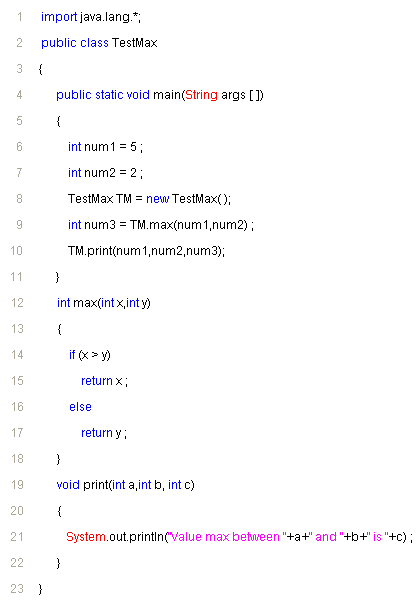 อธิบายโปรแกรม จากโปรแกรมเราจะเห็นว่าภายในคลาส TestMax นั้นมีอยู่ 2 Method คือ max กับ print ผมจะอธิบายแต่ละ Method อย่างละเอียดดังนี้