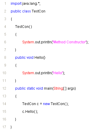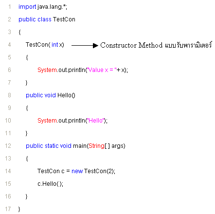 อธิบายโปรแกรม จากโปรแกรมเราจะเห็น Method ชื่อ TestCon() เป็น Constructor Method โดยทำหน้าที่แสดงผลประโยค "Method Constructor" ออกมาทุกครั้งที่เราสร้าง object จาก Class นี้ ให้สังเกตที่ main นะครับ object ชื่อ c ถูกสร้างขึ้นมา และเรียกใช้ Method ชื่อ Hello() แล้วผลลัพธ์ที่ออกมาคือ จะแสดงข้อความ "Method Constructor" และข้อความ "Hello" ออกมาทั้ง 2 ข้อความครับ ลองรันดูนะครับ