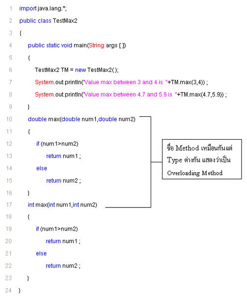 int และ double เราจะเห็น Method ชื่อ max อยู่ 2 Method นะครับ แต่ต่างกันตรงที่