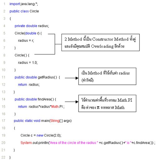 อธิบายโปรแกรม จากโปรแกรมนี้ภาพรวมของโปรแกรมคือ การหาพื้นที่ของวงกลม ให้สังเกตที่ Constructor Method นะครับ มีอยู่ 2 แบบครับ แบบแรก Circle(double r) นั้นรับพารามิเตอร์เป็น double ครับ คือ ค่าของรัศมีที่เป็นตัวเลขใดๆ ก็ได้ที่เราต้อง การหาพื้นที่ของวงกลม ส่วนแบบที่สอง Circle( ) ไม่รับพารามิเตอร์ครับ คือ ถ้าเราไม่ส่งค่ารัศมีให้มันจะมาเซตค่าของรัศมีเป็น 1.0 ที่ Method นี้โดยอัตโนมัติ