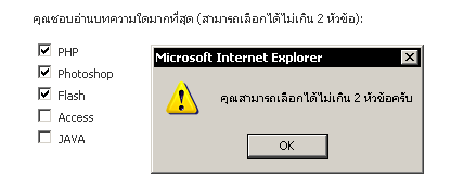 4. เสร็จแล้วครับ พอเราคลิกเลือกที่ Checkbox เกินกว่าที่เรากำหนดก็จะแสดง Alert แจ้งขึ้นมาครับตามรูปด้านล่างครับ