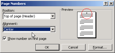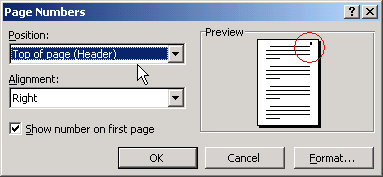 เลือก Top of Page ตัวเลขจะแสดงที่ด้านบนของเอกสาร