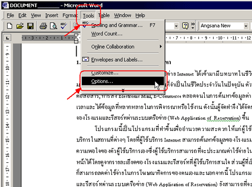 1. เปิดเอกสาร Word ขึ้นมา => คลิ๊กที่ Tools บน Toolsbar => คลิ๊กเลือกแถบ Options