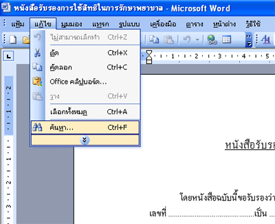 1. เมื่อเราต้องการที่จะค้นหาขอความในเอกสารที่เราสร้างขึ้นไว้ และต้องการแก้ไขข้อความในเอกสารนั้นมีวิธีการดังนี้คือ ทำการเปิดเอกสารที่เราต้องการแก้ไขเลือกคำสั่ง แก้ไข/ค้นหา ตามรูปภาพด้านล่าง