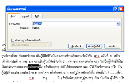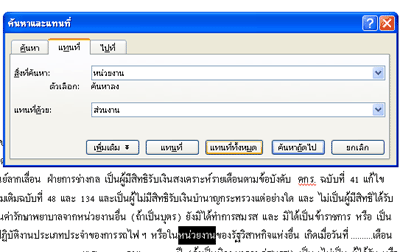 3. ในคำสั่งนี้เราอาจเลือกที่จะแทนที่คำที่เราค้นหาได้ด้วยโดยให้ทำการเลือกที่เมนูคำสั่ง แทนที่ และทำการกรอกข้อความในกล่องข้อความแทนที่ด้วยแล้วคลิกแทนที่ข้อความที่ต้องการ หรือแทนที่ทั้งหมดในเอกสาร